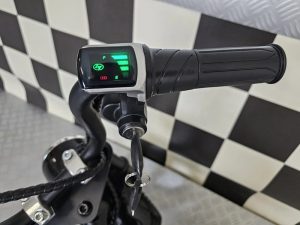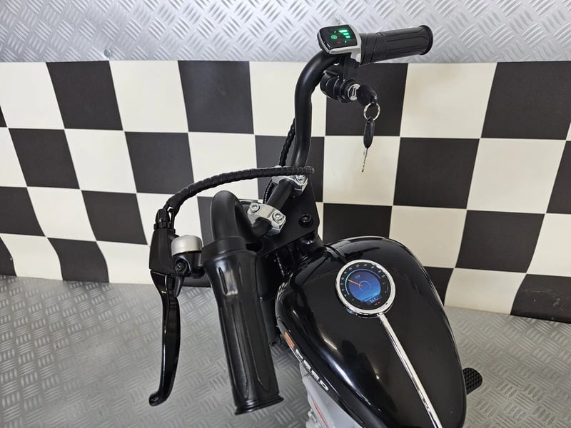 Equipé d’un vrai moteur Brushless 24V 200W, la puissance est directement transmise sur la roue arrière. Finit les soucis de chaines trop tendues ou pas assez ! Une batterie 24V 7 Ah qui sera installée dans ce Chopper, offrant une autonomie plus que raisonnable. L’accélération se fait à la poignée. Il y a également une poignée de frein reliée à l’étrier arrière (pas de freins avant). Allez voir les caractéristiques ci-dessous pour plus de précisions.